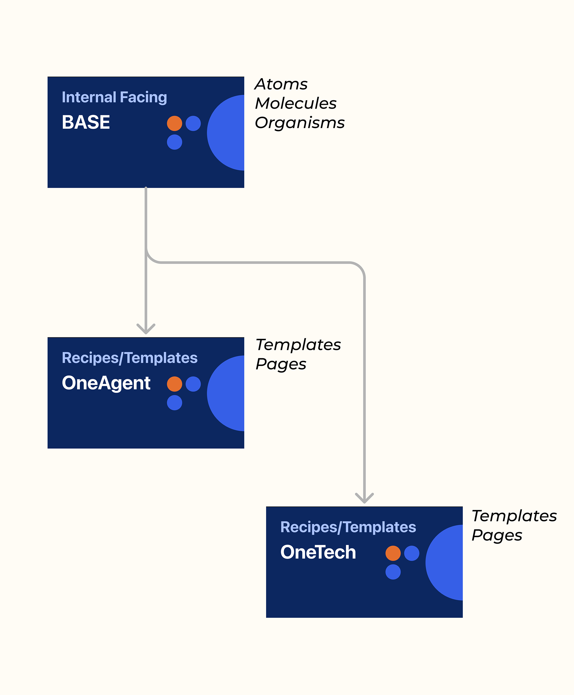 Using the insights and decisions from the audits, we developed a scalable library with standardized components, tokens, and robust documentation. The file structure supports product- and device-specific variations, ensuring the system can evolve alongside future tool development. The diagram on the right shows the structure for our files and a scalable solution - allowing other internal tools to feed from a cohesive library of 'Base'.